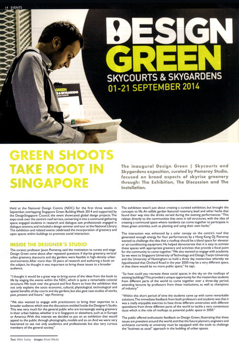 "The inaugural Design Green | Skycourt and Skygardens exposition, curated by Pomeroy Studio, focused on broad aspects of skyrise greenery thrugh: The Exhibition, The Discussion and The Installation. "